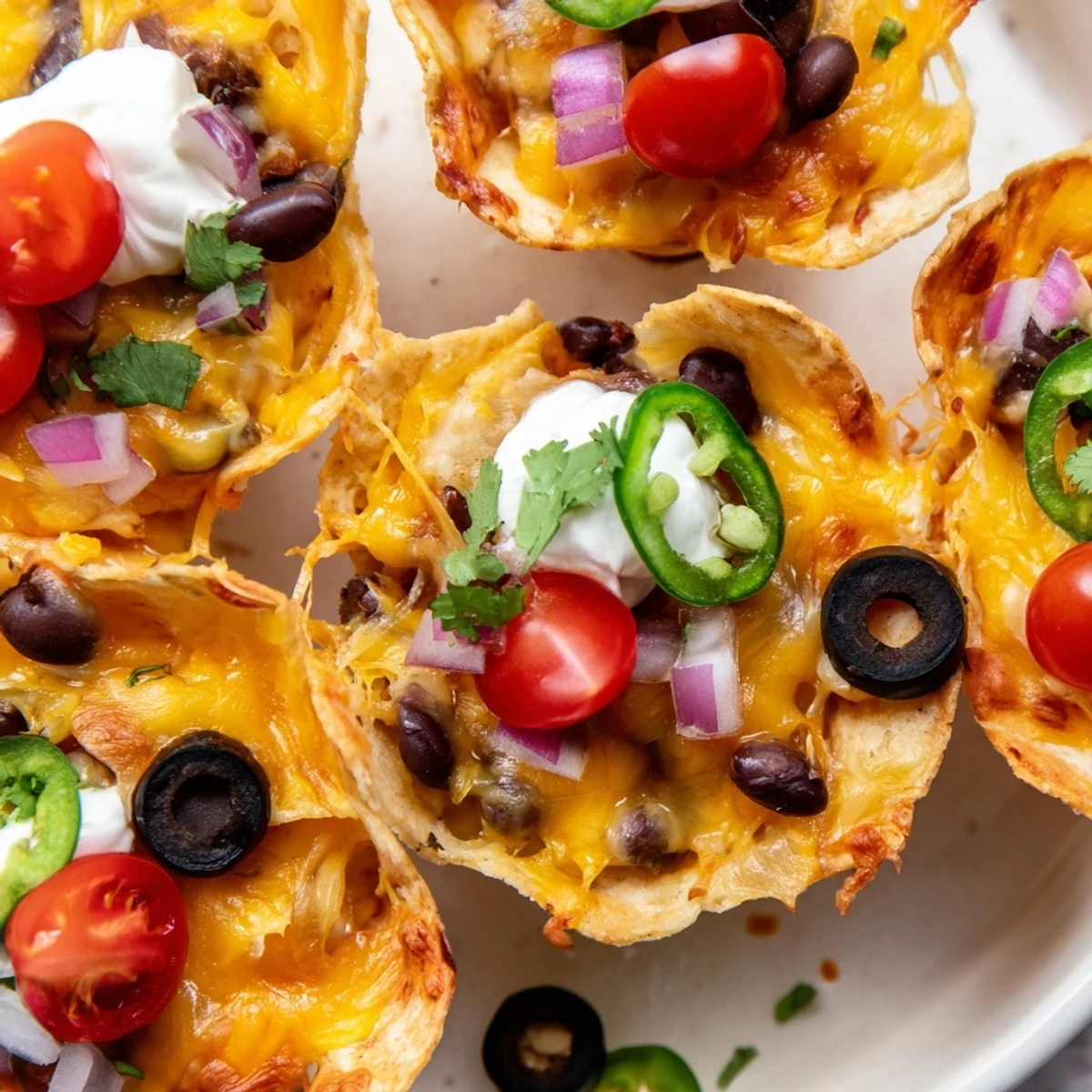 These individual nacho cups transform ordinary tortilla chips into handheld vessels of cheesy goodness. Simply press scoop-style chips into a mini muffin tin, layer with shredded cheddar and Monterey Jack, then pile on black beans, diced tomatoes, olives, jalapeños, and red onion. After 10 minutes in the oven, the cheese turns golden and bubbly while the chips crisp up even more. Top with sour cream and fresh cilantro for a two-bite appetizer that disappears fast. The assembly is flexible—add seasoned ground beef or shredded chicken for heartier versions, or swap pepper jack for extra kick. Pair with margaritas or cold lager for the ultimate game day spread.