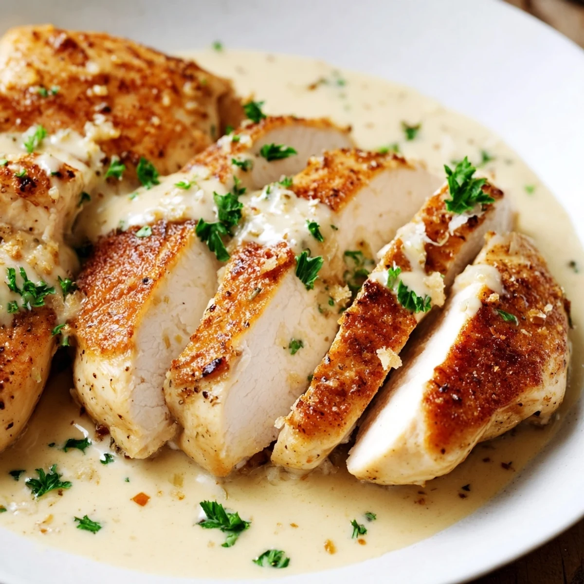 Transform simple chicken breasts into an elegant dinner with this creamy garlic creation. The tender meat simmers in a luscious sauce crafted from heavy cream, Parmesan, and aromatic garlic, creating layers of savory depth in every bite.