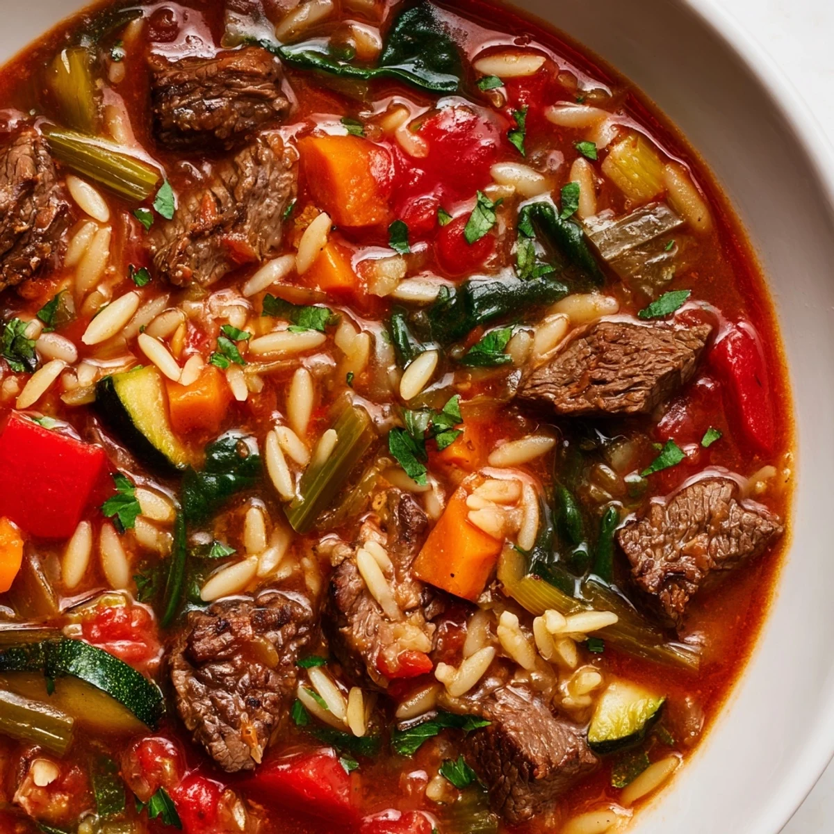 This satisfying soup combines succulent beef pieces with small orzo pasta and an abundance of garden vegetables including carrots, celery, bell pepper, zucchini, and green beans. The broth is enriched with tomato paste and aromatic herbs like thyme and oregano, creating layers of flavor. After simmering until the beef becomes fork-tender, fresh spinach is added at the end for vibrant color and extra nutrition. Perfect for meal prep as the flavors deepen overnight, and pairs beautifully with crusty bread.