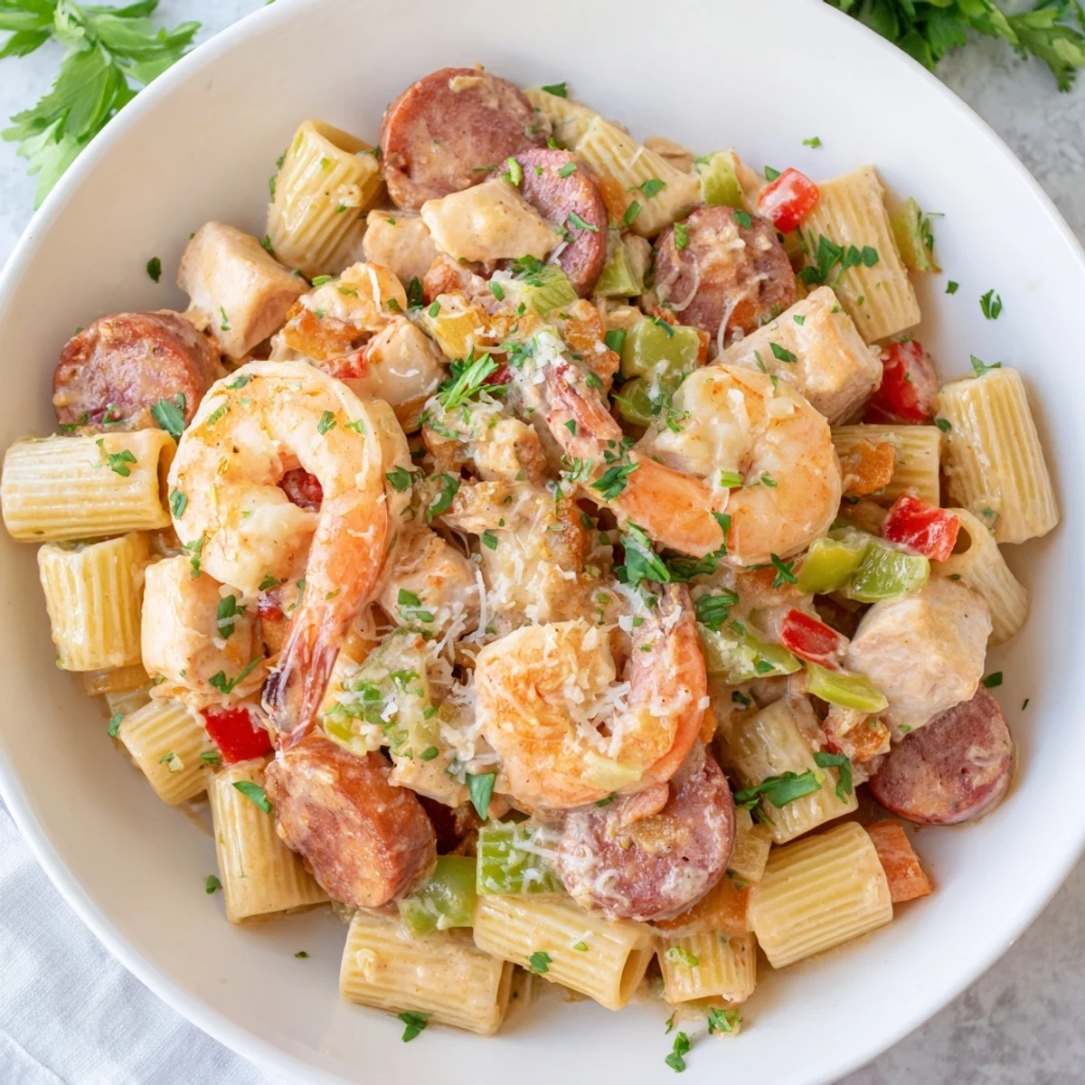 This vibrant dish combines the bold flavors of Cajun and Creole cooking with tender sausage, chicken, and shrimp. Sautéed vegetables and spices create a rich, spicy base, while tender pasta tossed in a creamy sauce delivers a comforting finish. Perfect for a festive occasion, it balances smoky paprika, cayenne heat, and fresh herbs for a satisfying and hearty meal. The inclusion of Parmesan adds depth and smoothness, making each bite flavorful and indulgent.