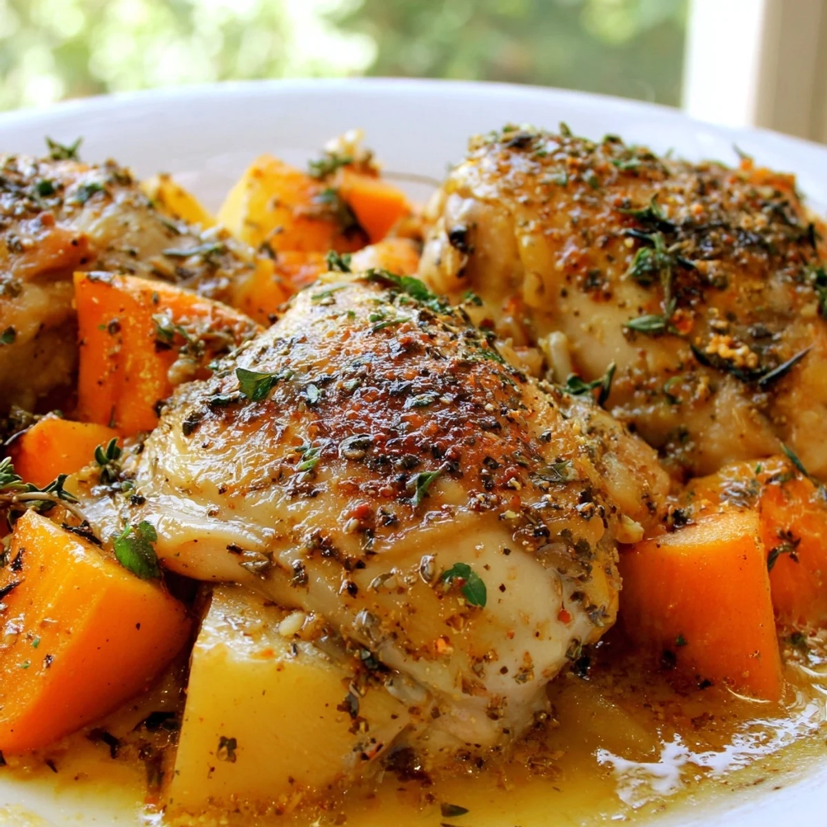 This comforting chicken dinner features tender, juicy thighs slow-cooked alongside hearty chunks of carrots, potatoes, onions, and celery. The meat is seasoned with a blend of thyme, rosemary, and paprika, then simmered in chicken broth until falling-apart tender. After six hours of low-and-slow cooking, the vegetables absorb all the savory flavors, creating a rich sauce that perfectly coats each bite. It's an effortless hands-off meal that delivers hearty, homemade comfort with minimal preparation work.
