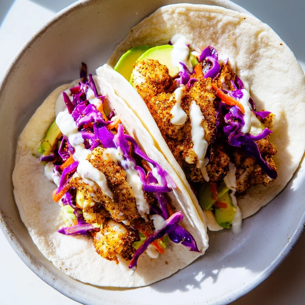 Crispy tilapia fillets seasoned with chili powder, cumin, and smoked paprika create the perfect base for these vibrant Mexican-inspired tacos. The fish gets pan-seared until golden and flaky, then piled onto warm tortillas with a refreshing cabbage and carrot slaw dressed in lime. A drizzle of tangy lime crema ties everything together, while fresh avocado, cilantro, and extra lime wedges add bright finishing touches.